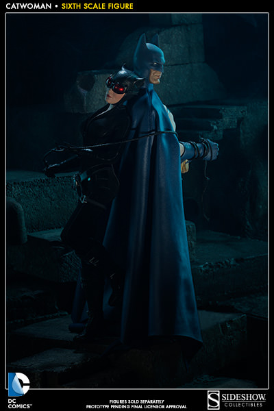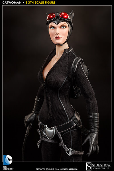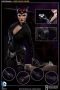 Gotham City's resident cat burglar has arrived. Sideshow Collectibles is proud to introduce the elusive and alluring Catwoman. Fitted with a sleek black bodysuit and a few key tools of her trade, Selina Kyle is more than ready for her next heist. A helpful climbing harness will come in handy when making a quiet entrance or a hasty exit, and her trademark whip keeps the boys in line. A girl can't leave home without the right accessories, so we've included a cat-shaped belt buckle, infrared goggles, burglary friendly boots and of course, this cat has claws! Two hand-painted portraits purr-fect our feline femme fatale, one with Selina's mischievous smirk, the second shows off her more ferocious side. Gentlemen of Gotham City, keep a tight grip on your fortune and your heart.